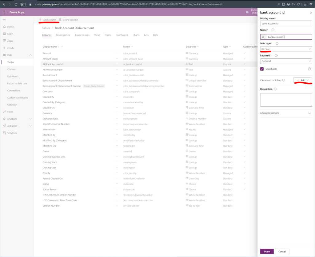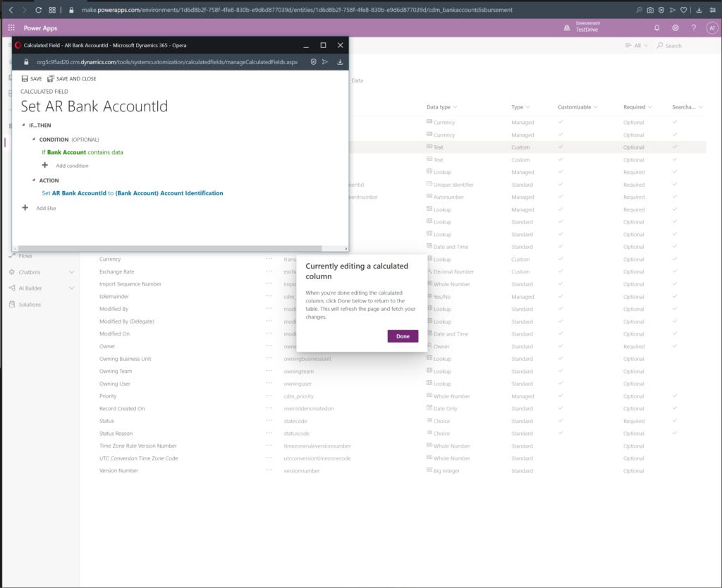To resolve this, create a new field in bankaccountdisbursement entity add a calculation. It is important to add calculation while creating. Otherwise, it creates a regular string field. When you click done it will pop up calculation field.