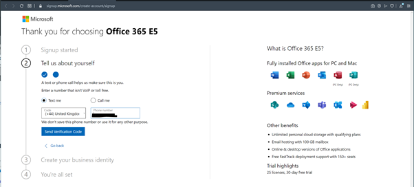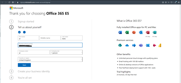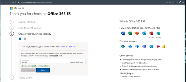 Chose an onmicrosoft subdomain name for your test organisation. After you put in, it will validate if it is available or not. It will use this for website naming of Sharepoint, dynamics etc. So pick a proper name.