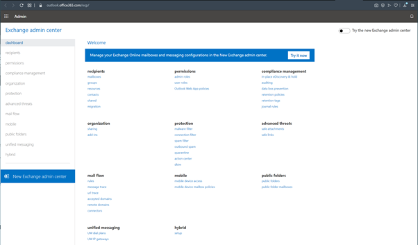 If you need to test exchange functions like sharing mailboxes you can go to exchange admin site from office 365 admin site.