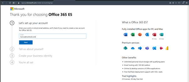 This will be initially youraccount@yourtestorganization.onmicrosoft.com account and it will have all features until the trial period ends. I personally prefer the “admin” account for the first one. You can create other accounts later either from Office365 admin centre or Azure portal.